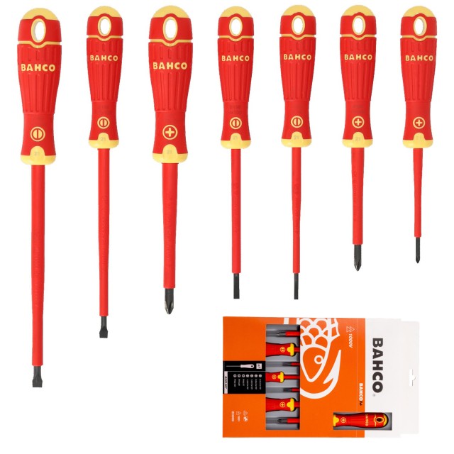 Juego de siete Phillips y Planos Aislados. Incluye 0,5 x 3 x 100 mm, 0,8 x 4 x 100 mm, 1 x 5,5 x 125 mm, 1,2 x 6,5 x150 mm planos; PH0 x 75 mm, PH1 x 80 mm, PH2 x 100 mm phillips Para trabajos en equipos de baja tensión de hasta 1000V